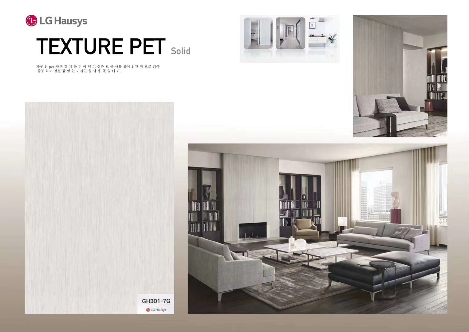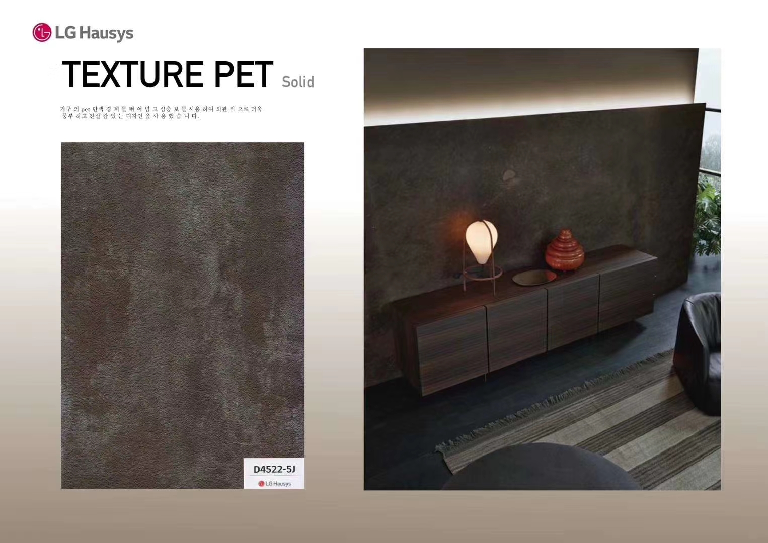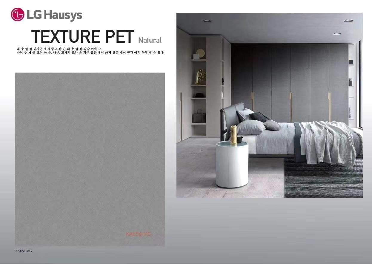 Un gaufrage profond est appliqué à la couleur unie PET utilisée uniquement pour les meubles, illustrant la riche réalité à l'extérieur. Une ambiance élégante sur la surface est créée en transformant la brillance unique du PET en un design mat.