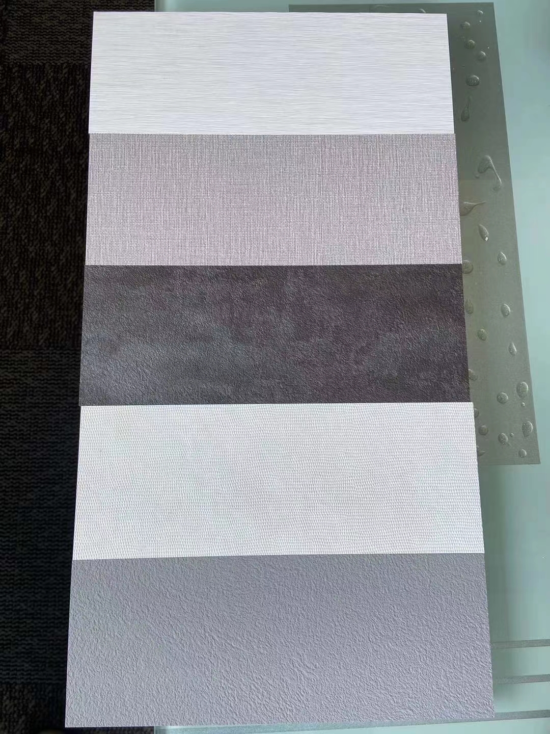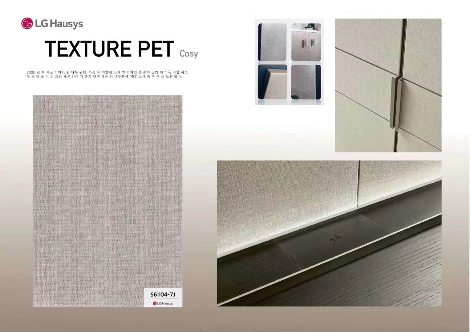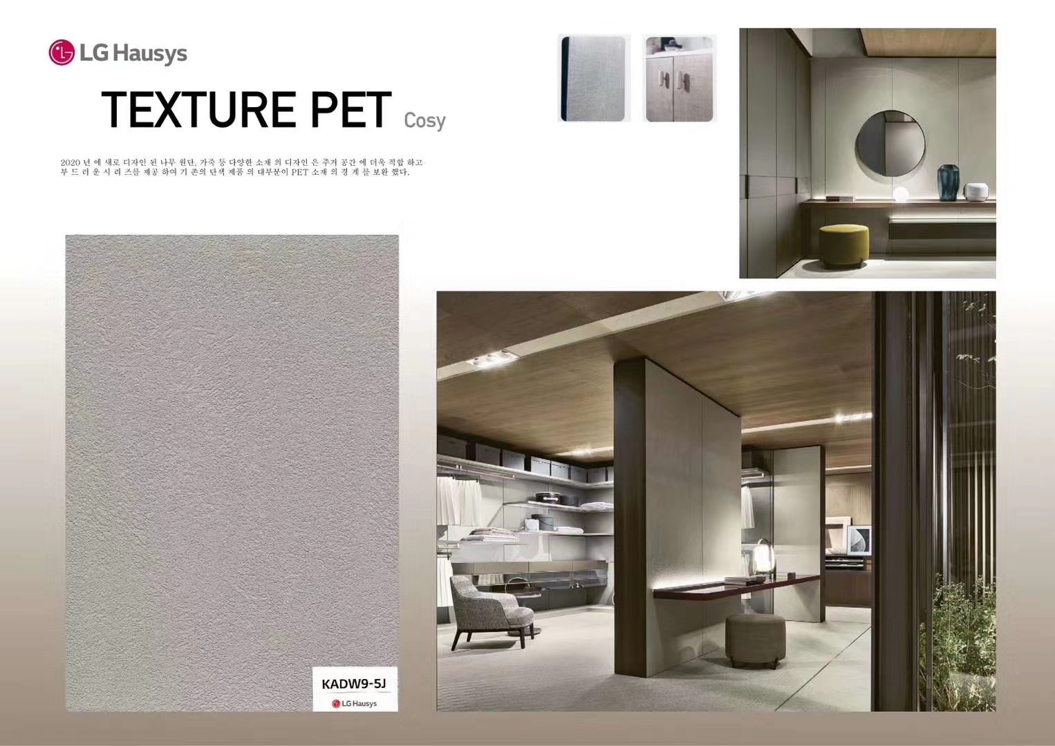 Un gaufrage profond est appliqué à la couleur unie PET utilisée uniquement pour les meubles, illustrant la riche réalité à l'extérieur. Une ambiance élégante sur la surface est créée en transformant la brillance unique du PET en un design mat.