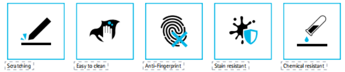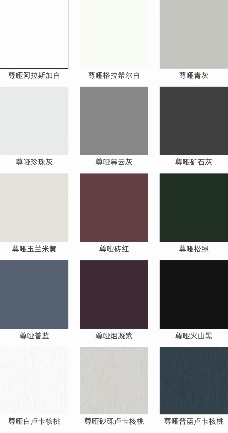Couleur | Couleurs unies avec effets Premier Matt ou High Gloss ; Couleurs douloureuses avec gaufrage du bois en Premier Matt |